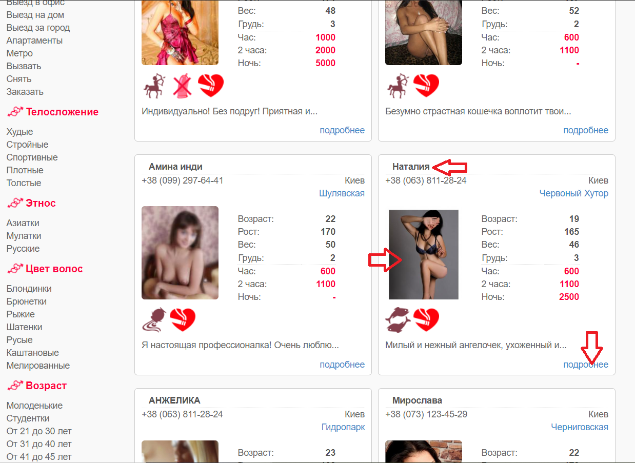Выберите из списка анкет ту, которая вас интересует и откройте её. Для этого нужно нажать на имя девушки в анкете, или на её фотографию, или на слово "подробнее" в нижнем правом углу нераскрытой анкеты. Смотрите скрин: